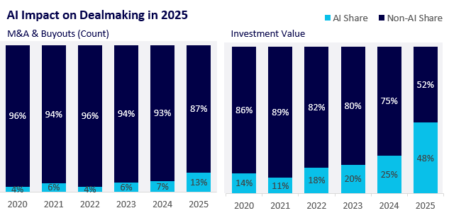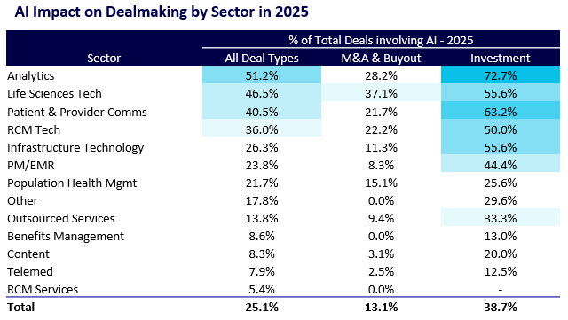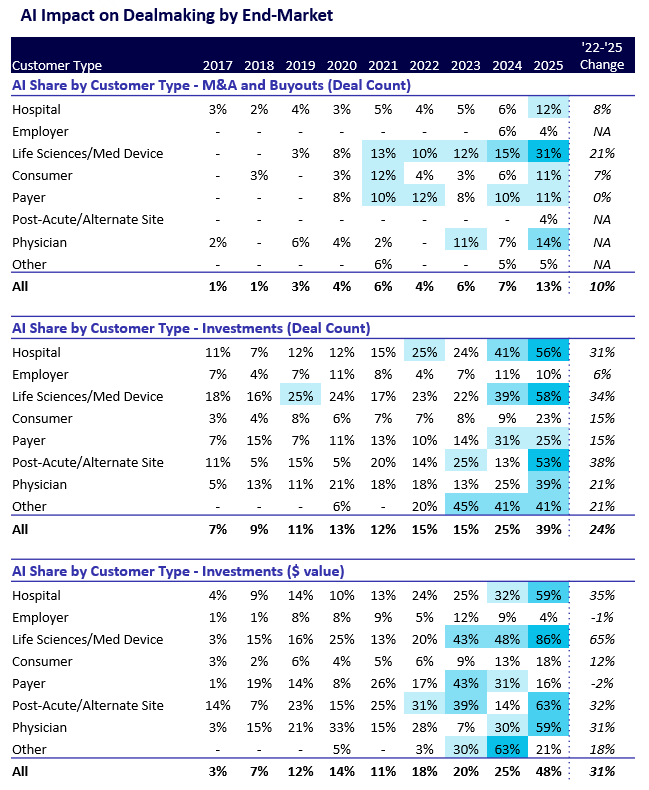 AI adoption also varies materially by end market. Life sciences and medical device companies have emerged as leaders, both in M&A volume and investment volume and value. This reflects stronger data density and access, clearer ownership and governance of data assets, and more direct ROI tied to R&D productivity, clinical trial optimization, and regulated workflows. Providers (across hospitals, physician practices, and post-acute care) are next in line, a trend driven by sustained margin pressure, rising labor costs, and the need to improve administrative efficiency at scale.