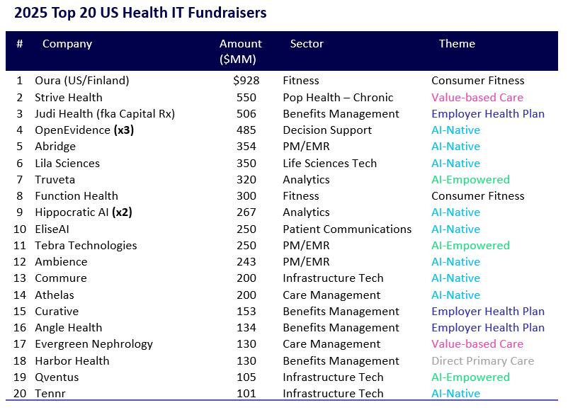 That said, the top 20 still reflect a broader set of durable healthcare investment themes. Consumer-driven care and patient empowerment are evident in Oura, Function, and Harbor Health. Judi, Curative, and Angle are rethinking employer-sponsored healthcare, introducing alternative models aimed at reducing costs below other options. Meanwhile, Strive Health and Evergreen Nephrology represent the continued momentum behind value-based care, a major focus of healthcare expenditure in the US.