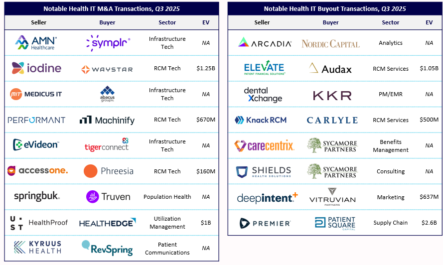 Health IT M&A Activity Accelerates Through Q3, Led by the Upper-End: M&A volume reached 111 U.S. transactions in Q3, up from 100 in Q2 and 93 in Q1, tracking to exceed 2024 totals by ~25%. Recent announcements including Press Ganey/Qualtrics, Kyruus/RevSpring, and Premier/Patient Square Capital reflect a market heating up at the upper end.