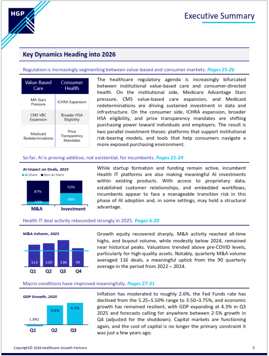 Healthcare Growth Partners is excited to release its January 2026 Health IT Market Review, offering a detailed analysis of the trends and dynamics shaping the industry. From M&A valuations and funding trends to regulatory developments, this report explores the major forces poised to shape the Health IT landscape going forward.